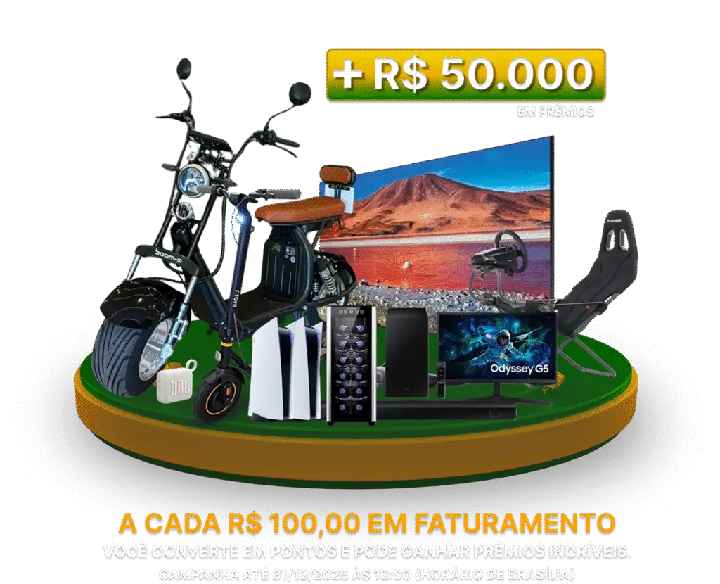 (1x) Moto Elétrica X11, (1x) Patinete Elétrico, (2x) PlayStation 5 Edição Digital 500GB ou superior, (1x) Kit Racing composto por Cockpit Playseat F1 e Volante G29, (2x) Monitores Gamer Samsung Odyssey G5, (4x) Samsung Smart TV 4K de 50″ para se preparar etorcer para o Brasil em 2026, (2x) Adegas Electrolux para 12 garrafas, (2x) Soundbar Samsung com Subwoofer para dar aquela sensação de cinema na sua sala e mais (10x) Caixas de Som Portátil JBL para animar, ainda mais, as suas festas.